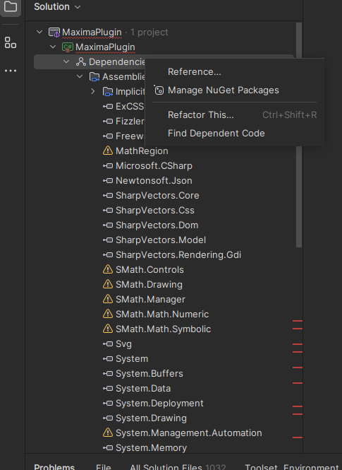 - Then navigate to the SMath project folder and select the csproj file. Upon opening, Rider will complain about the missing dependencies. Here we must set the dependencies manually.