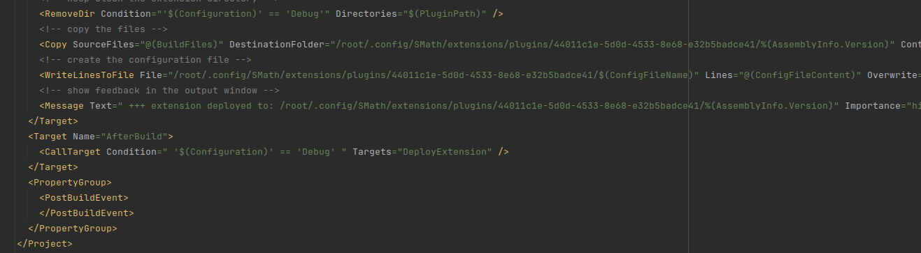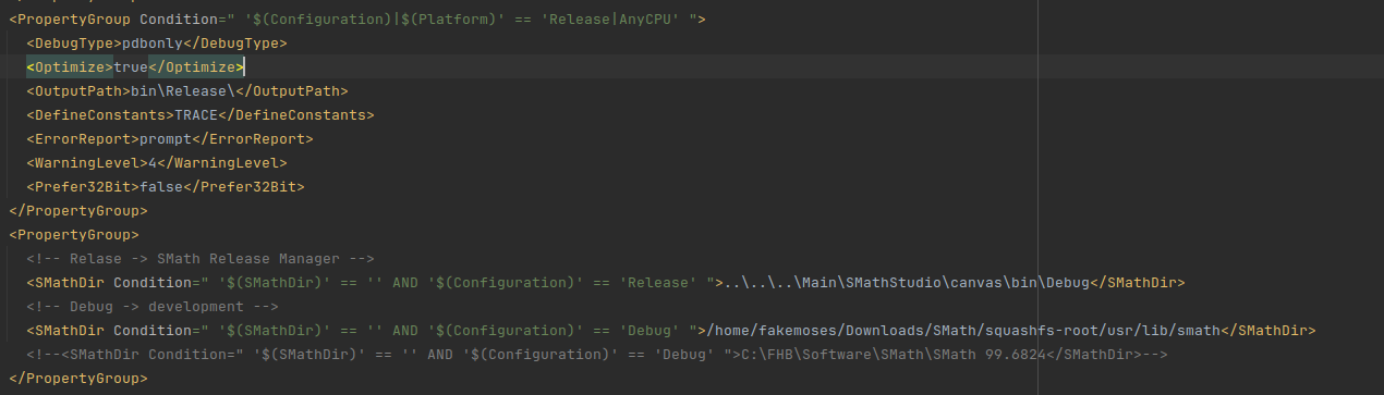 - Now we need to manually edit the csproj file so that the path for SMath executable, the path to copy the files are correct!